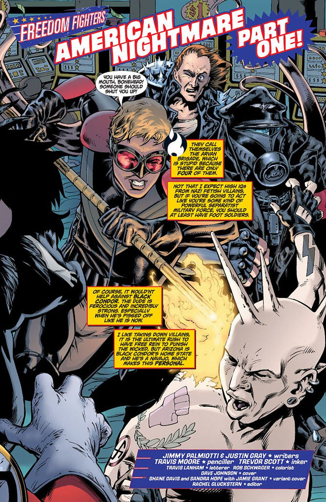 Written by Justin Gray, Travis Moore, Jimmy Palmiotti. A new call to arms begins as Uncle Sam and the Freedom Fighters return in an all-new action packed ongoing series helmed by the writing team of Justin Gray & Jimmy Palmiotti with art by Travis Moore and Trevor Scott! A national mystery unfolds when the government learns of the existence of a Confederate super weapon intended to insure the South won the Civil War. Who built it and why wasn't it used? Find out when Uncle Sam leads the team on a quest through the hidden history of the United States! With new challenges and old threats returning to plague them, the stakes are higher than ever. Can even these stalwart heroes stand by their duty when their country calls?