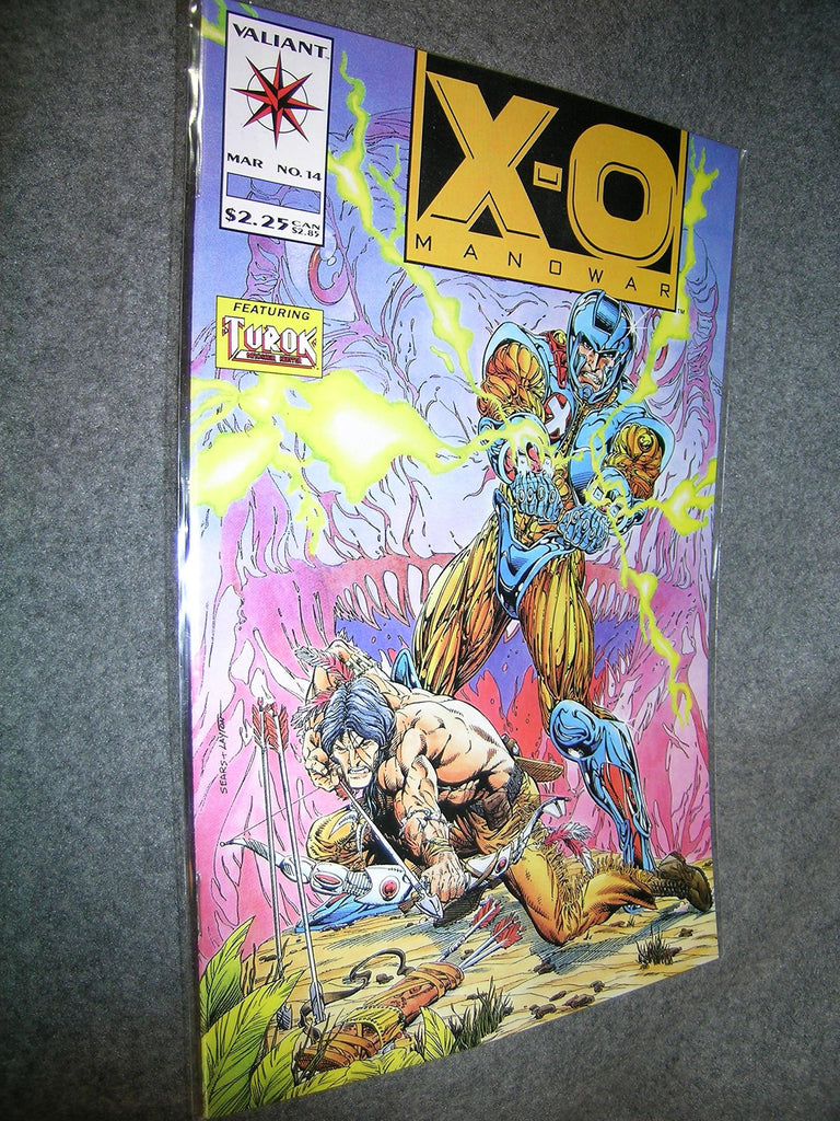 This eponymous comic book series is published by Valiant Comics. "The Coming of Turok, Dinosaur Hunter" is about fictional superhero co-created by writer and former Marvel Comics editor-in-chief Jim Shooter, artist Bob Layton, and Jon Hartz. (Current Marvel Comics Chief Creative Officer Joe Quesada was a key creator in the origin of X-O Manowar as seen in X-O Manowar #0.)